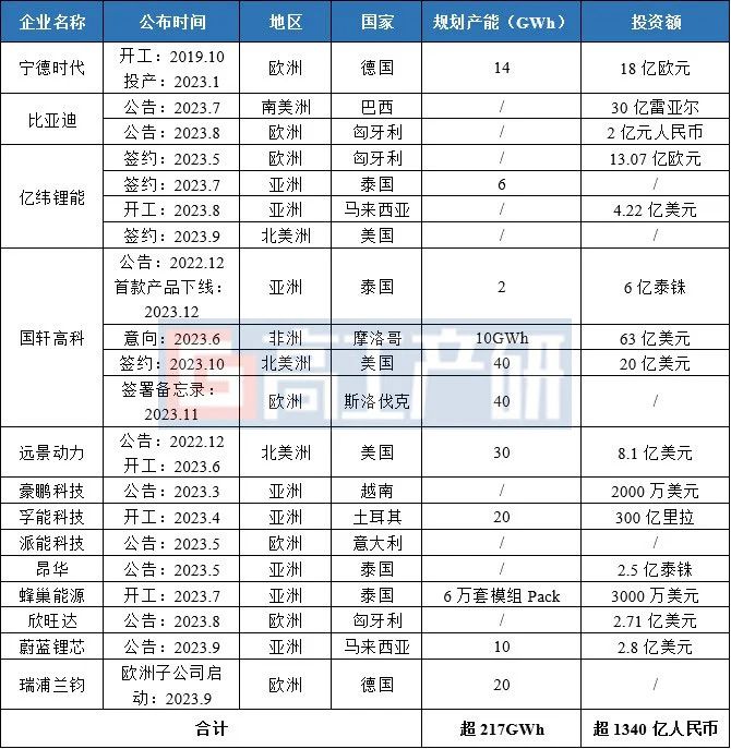 鋰電池出海方面,據(jù)高工產(chǎn)業(yè)研究院(GGII)不完全統(tǒng)計,2023年國內(nèi)共有13家鋰電池企業(yè)奔赴海外建廠(包括簽約、公告、開工等),較2022年增加8家企業(yè),同比增長160%,按公布投資金額的16個項目統(tǒng)計,總投資額超1340億元。