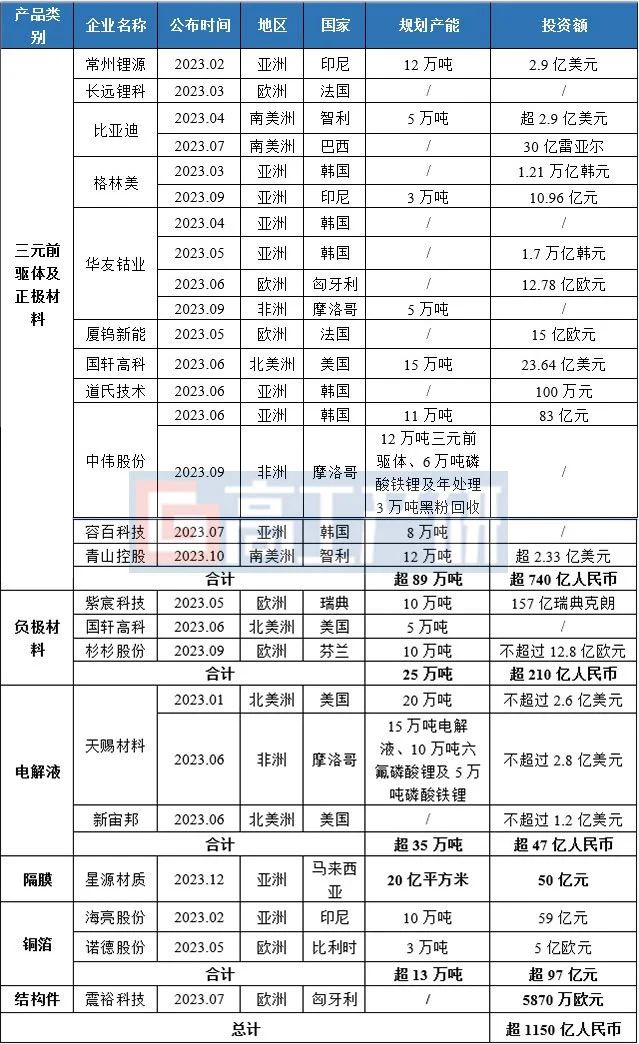 為此,布局海外市場成為2023年鋰電產(chǎn)業(yè)鏈擺脫“內(nèi)卷”,打造第二增長曲線的重要方式。2023年成為我國鋰電產(chǎn)業(yè)鏈布局海外,走向全球的重要一年,產(chǎn)業(yè)鏈各環(huán)節(jié)企業(yè)均加速在海外布局建廠,一方面更靠近海外客戶,另一方面也是為了規(guī)避相關(guān)政策法規(guī)的限制。
