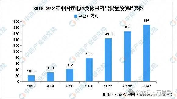 受益于國內外新能源汽車等終端市場增長拉動,我國鋰電池相關行業(yè)發(fā)展快速,負極材料市場需求增大。中商產業(yè)研究院發(fā)布的《2022-2027年中國鋰電池負極材料行業(yè)市場深度分析及發(fā)展趨勢預測報告》顯示,2022年中國鋰電池負極材料出貨量約為143.3萬噸,同比增長84%。中商產業(yè)研究院分析師預測,由于受到石墨出口管控的影響,2023年出貨量將保持增長但增速將減緩,出貨量將達167萬噸,2024年將達189萬噸。