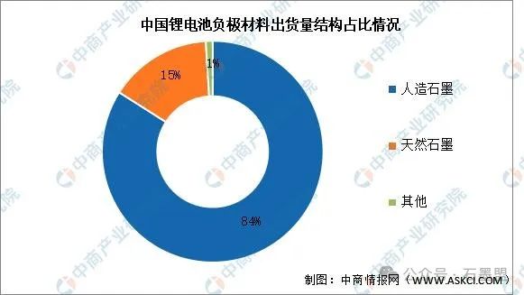 目前,中國鋰電池負極材料主要以石墨為主,其中人造石墨占比最高。2022年人造石墨占鋰電池負極材料的84%,天然石墨占比達15%。